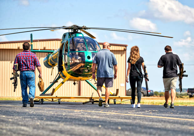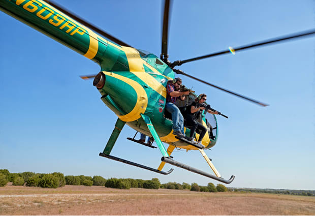 Many also recognized a business opportunity. Among them: Blume, with his chinstrap beard and passing resemblance to Baker Mayfield. After a few stabs at college, he says, he was “fumbling around at life,” working at a military-training company and failing to catch on with the French Foreign Legion. Eventually he started helping an acquaintance book aerial hog hunts, and in late 2013 he got to know a former Air Force mechanic, Richard Potts, who owned a four-seat helicopter. Blume brought the bushy-goateed Potts into the fold, and that was the start of Last Shadow, which today zips clients around a 300,000-acre zone surrounding its base in Temple, smack between Austin and Dallas