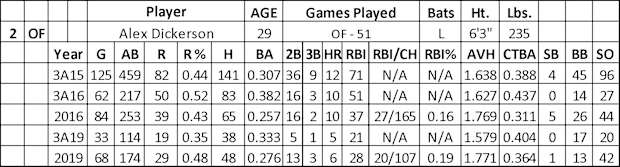 Dickerson missed 2017 and 2018 with a back issue and TJ surgery. His bat played well over the first 24 games at AAA (.360 with five HRs and 19 RBI over 86 at-bats), which led to a call-up to the majors in early May. The Giants barely gave him playing (3-for-19 at-bats with no HRs and two RBI) before landing the injured list with a wrist issue for two weeks. After three weeks back at AAA (7-for-25 with no HRs and two RBI), Dickerson earned his second chance with San Fran (.386 with six HRs and 23 RBI over 88 at-bats).