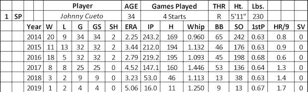 After a down season in 2017 (4.52 ERA and 1.446 WHIP), Cueto looked better the next year over 53 innings (3.23 ERA), but his season ended with a TJ surgery on his right elbow. In 2019, he returned to the mound in August. After six appearances in the minors (3.28 ERA, 0.9844 WHIP, and 21 Ks over 21.1 innings), Cueto made four starts for the Giants in September (nine runs, 20 baserunners, and three home runs over 16 innings). His AFB (91.2) came in well below his peak in 2011 (94.2). He continues to feature a four-seam, sinker, changeup, and slider combination of pitches.