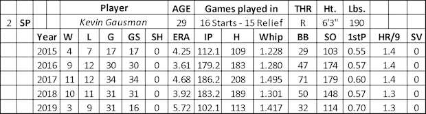 After two most pastings (11 runs and 20 baserunners over 10.2 innings), the Braves traded him to the Reds. Gausman posted a 4.03 ERA and 29 strikeouts over 22.1 innings out of the bullpen. On the year, his walk rate (2.8) and strikeout rate (10.0) will draw attention from fantasy owners, but he allowed more hits than innings pitched for the fifth straight year with a career battle with home runs (1.3 per nine). Gausman lost some value off his fastball (94.1) in each of the four previous years. His best pitch is a split-finger fastball (.234 BAA). For some reason, he dumped his slider in 2019, which left only his four-seamer (.322 BAA) to battle hitters.