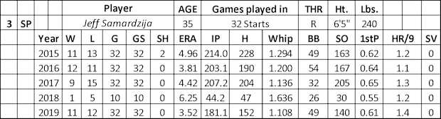 More of his problems in home runs came against left-handed batters (.233 with 17 HRs over 339 at-bats). His AFB (91.9) was 1.4 MPH lower than 2018 (93.3) and miles away from his peak in 2012 (96.1). He had success with his four-seam (.183 BAA), slider (.234 BAA), and cutter (.177 BAA). Samardzija struggled with his sinker (.289 BAA) and lost the feel for his split-finger fastball (.279 BAA). Even with some favorable stats and strength in his walk rate (2.4), he still has no draftable value based on his ADP (354) and expected direction.