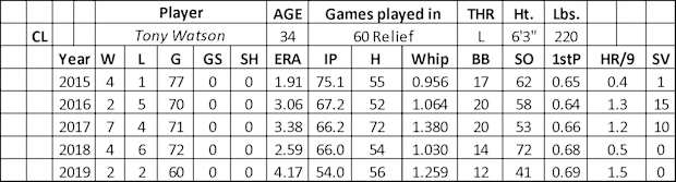 Watson was a top left-handed reliever for the Pirates for seven seasons (31-16 with 2.68 ERA and 380 Ks over 433 innings). He picked 25 saves between 2016 and 2017 before a midseason trade to the Dodgers. Last year his strikeout rate (6.8) was 3.0 lower than in 2018 (9.8) while struggling with home runs (1.5 per nine). His ERA (4.17) and WHIP (1.259) are no longer assets. Watson lost his way over the final three weeks in August (11 runs, 18 baserunners, and three home runs over 7.1 innings) before going on the injured list with a broken left wrist. His AFB (93.5) was league average. He still threw a changeup (.225 BAA) of value with success with his low volume four-seamer (.143 BAA). Watson lost the feel for his sinker (.291 BAA) and slider (.474 BAA).