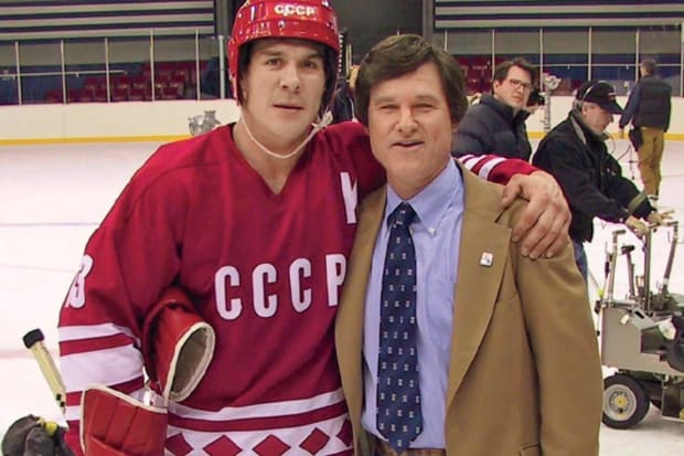 Harkins, who hadn’t touched his skates since retirement, tried out for the film and was cast as Soviet Union player Valeri Kharlamov. “Director Gavin O’Connor heard the story about Nicklas,” Harkins said. “My family came to the set one day, and Nicklas skated out on the ice with me dressed in a Kharlamov jersey and got to score on the goalies.”